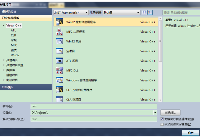 1)、文件->新建->项目->Visual C++->Win32 控制台应用程序(输入名称test)